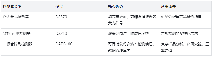 作為檢測信號的“捕捉者”,檢測器的性能直接決定了檢測結(jié)果的精準(zhǔn)度。依利特旗下的檢測器系列堪稱行業(yè)標(biāo)桿:D2370激光熒光檢測器,具備超高靈敏度,能精準(zhǔn)捕捉微弱熒光信號,適用于痕量分析等高端檢測場景;D3210紫外-可見檢測器,波長范圍廣、響應(yīng)速度快,滿足常規(guī)檢測的多樣化需求;DAD3100二極管陣列檢測器,可同時獲得多波長檢測信號,為復(fù)雜樣品分析提供更全面的數(shù)據(jù)支撐,無論是科研實驗還是工業(yè)質(zhì)檢,都能輕松應(yīng)對。