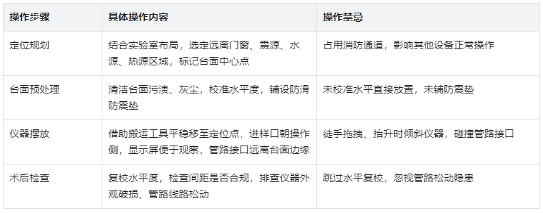第四步,術(shù)后檢查。擺放完成后,再次用水平儀校準(zhǔn)儀器水平狀態(tài),檢查儀器與臺面、周圍設(shè)備的距離是否符合要求,確認無遮擋、無擠壓;同時檢查儀器外觀是否有破損,管路、線路是否松動,確保放置后儀器處于安全待命狀態(tài)。