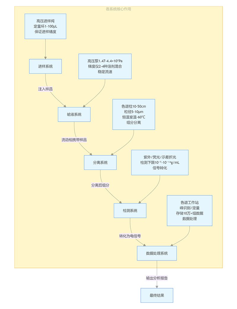 高效液相色譜儀主要由進(jìn)樣系統(tǒng)、輸液系統(tǒng)、分離系統(tǒng)、檢測系統(tǒng)和數(shù)據(jù)處理系統(tǒng)五大核心部分組成。下面將帶您詳細(xì)了解這五大系統(tǒng)的功能與特點(diǎn)。
