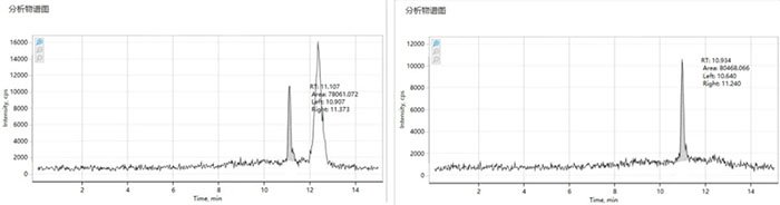左側(cè):使用某進(jìn)口品牌捕集柱,目標(biāo)峰后明顯伴隨寬峰干擾;