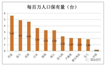 從保有量看,丹麥每百萬人口 PET-CT 保有量高,達(dá)到 5.61 臺 / 每百萬人,相比之下中國只有 0.18 臺 / 每百萬人,排名靠前的 10 個國家中,少的芬蘭也有 1.86 臺 / 每百萬人,設(shè)備數(shù)量方面有 10 倍多的提升空間。