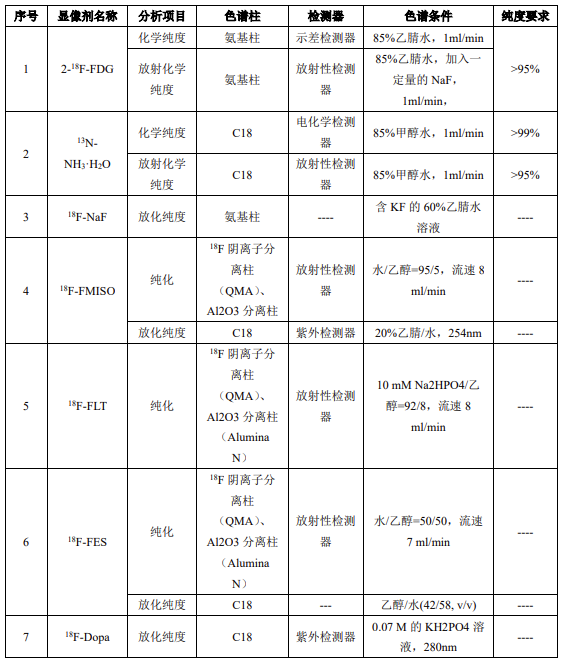 \(^{18}\text{F}\)是載于美國藥典的第一個 PET 放射性藥物,需要對放射性核純度、化學(xué)純度、放射化學(xué)純度、比活度等質(zhì)量指標(biāo)進(jìn)行控制,同時需要對合成反應(yīng)的副產(chǎn)物含量進(jìn)行控制,而液相色譜法是進(jìn)行\(zhòng)(^{18}\text{F}\)-FDG 化學(xué)純度分析的好方法。