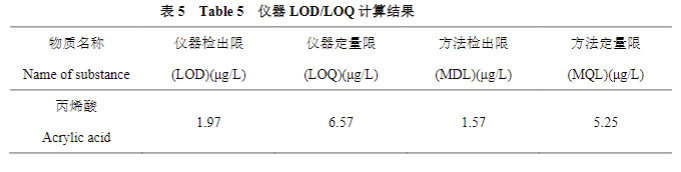 50 μg/L 的丙烯酸色譜峰信噪比(S/N)為 76,大于 10。進(jìn)一步計(jì)算儀器檢出限和定量限,如下表 5 所示: