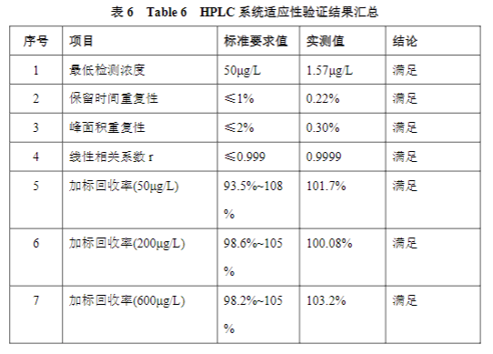 丙烯酸標(biāo)準(zhǔn)品采用依利特 iChrom5100 系統(tǒng)及 Supersil ODS2 5μm,ID4.6×250mm 色譜柱所測(cè)得的各項(xiàng)指標(biāo)均滿足系統(tǒng)適用性要求,具體如下表所示: