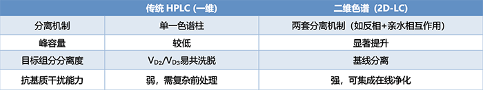 維生素D(VD)是維持人體鈣磷代謝平衡的關(guān)鍵營養(yǎng)素,其缺乏可導(dǎo)致兒童佝僂病和成人骨質(zhì)軟化癥。食品中VD主要以VD2(麥角鈣化醇)和VD3(膽鈣化醇)形式存在,兩者結(jié)構(gòu)高度相似(僅側(cè)鏈雙鍵位置不同),傳統(tǒng)HPLC(一維)難以實(shí)現(xiàn)完全分離,易導(dǎo)致定量誤差。本文基于EClassical 3200 HPLC/3200L UHPLC構(gòu)建二維液相色譜系統(tǒng)(2D-LC),結(jié)合GB 5009.296-2023《食品安全國家標(biāo)準(zhǔn) 食品中維生素D的測定》(第二法)要求,實(shí)現(xiàn)對食品中VD2和VD3的高效、精準(zhǔn)檢測。