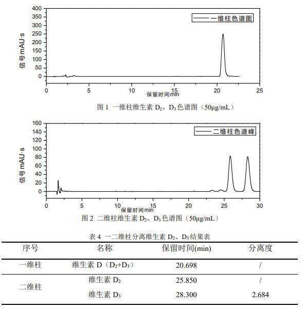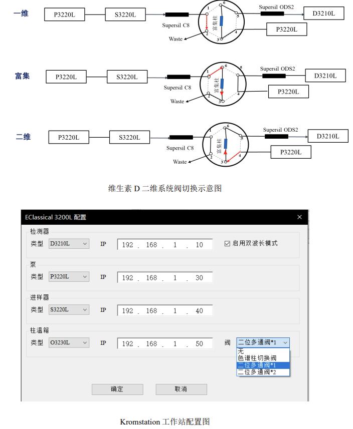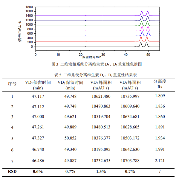 根據(jù)以上實(shí)驗(yàn)數(shù)據(jù),Kromstation 色譜數(shù)據(jù)工作站可以實(shí)現(xiàn)對(duì) EClassical 3200L 二維系統(tǒng)的全反控。根據(jù) GB 5009.296-2023《食品安全國(guó)家標(biāo)準(zhǔn) 食品中維生素 D 的測(cè)定》第二法:在線柱切換 - 反相液相色譜法(二維液相色譜法)分離維生素D_2、D_3,Kromstation 色譜數(shù)據(jù)工作站可以自動(dòng)實(shí)現(xiàn)二維系統(tǒng)的閥切換完成維生素D_2、D_3的分離,且實(shí)驗(yàn)結(jié)果具有良好的重復(fù)性和分離度,滿足對(duì)維生素 D 同分異構(gòu)體的分離檢測(cè)需求。