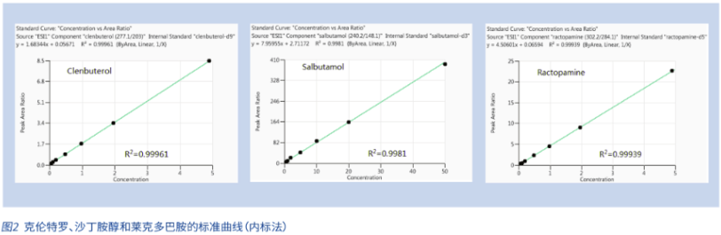 十三種 β- 受體激動劑在 0.05μg/L-5μg/L 濃度范圍內(nèi)均呈現(xiàn)良好的線性關系,相關系數(shù)≥0.995,典型代表化合物克倫特羅、沙丁胺醇和萊克多巴胺的標準曲線(內(nèi)標法)見圖 2。