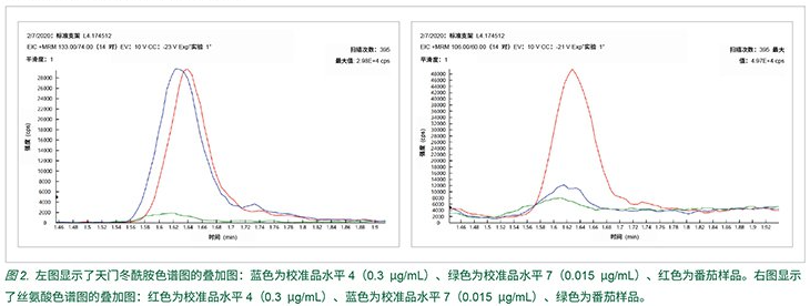 代表性數(shù)據(jù):天門冬酰胺、絲氨酸等氨基酸的校準(zhǔn)曲線線性優(yōu)異(見圖 1),不同濃度校準(zhǔn)品與番茄樣品的色譜圖重疊度高,分離效果清晰(見圖 2)。