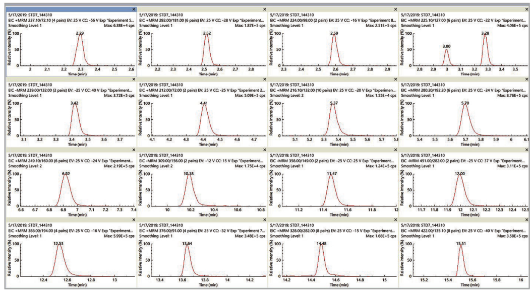 在上述實(shí)驗(yàn)條件下得到數(shù)種農(nóng)藥化合物的 MRM 色譜圖,見圖 1。