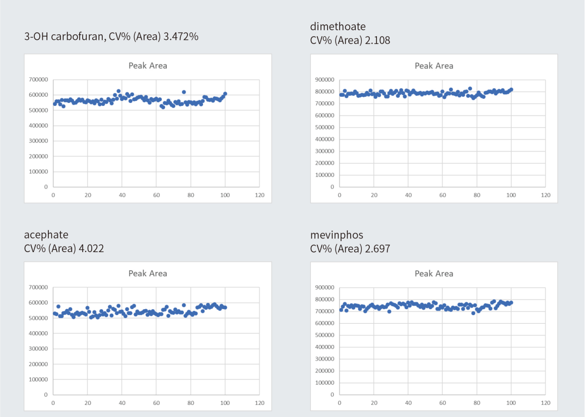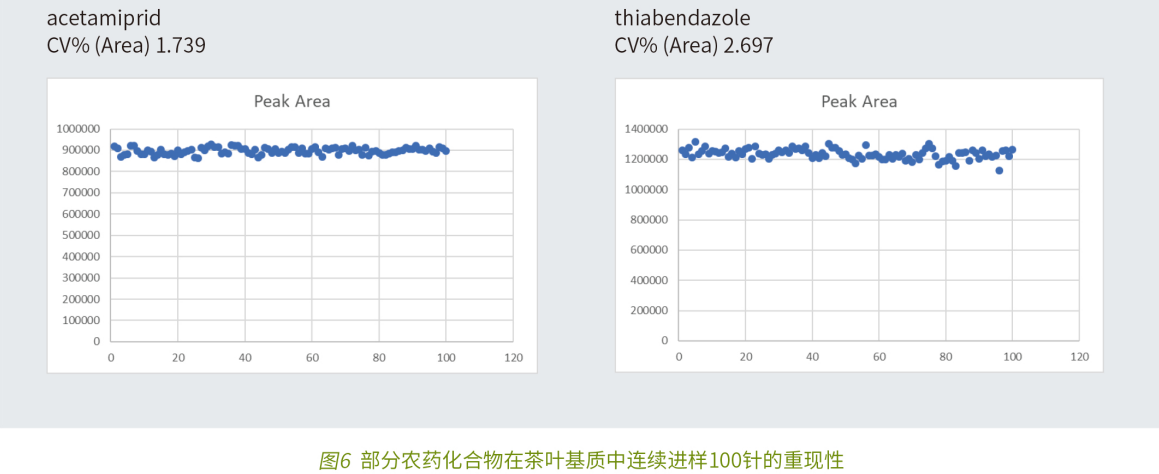 面對(duì)農(nóng)產(chǎn)品檢測(cè)越來越多樣和復(fù)雜的檢測(cè)樣品,三重四極桿質(zhì)譜的穩(wěn)定性和抗污染能力對(duì)于儀器的使用和維護(hù)來說也是非常重要的內(nèi)容。以待測(cè)樣品中常見而且非常復(fù)雜的茶葉基質(zhì)為例 (見圖 5),基質(zhì)加標(biāo)濃度 20ng/mL 連續(xù)進(jìn)樣 100 針,測(cè)試 MS2 Vertical9100 的耐臟性能。圖 6 展示了部分農(nóng)藥在 100 針進(jìn)樣條件下峰面積重現(xiàn)性均小于 5% 的良好數(shù)據(jù)。Elite MS2 Vertical 9100 系列三重四極桿質(zhì)譜具有獨(dú)特的 "不怕臟、臟不怕、怕不臟" 的硬件設(shè)計(jì):1. 帶有反吹干燥氣的雙錐孔質(zhì)譜接口結(jié)合離子源主動(dòng)排放廢氣泵設(shè)計(jì),具有優(yōu)異的抗污染能力,長時(shí)間無需維護(hù)離子源;2.HSID 熱表面誘導(dǎo)去溶劑質(zhì)譜接口技術(shù),320° 加熱的質(zhì)譜接口使得儀器有效防止樣品中的復(fù)雜基質(zhì)污染儀器,長時(shí)間運(yùn)行免于頻繁維護(hù);3. 層流氣離子導(dǎo)向技術(shù),提高離子傳輸效率避免頻繁的儀器調(diào)諧。優(yōu)異的耐臟基質(zhì)和污染物的硬件設(shè)計(jì),保證滿足檢測(cè)靈敏度要求的同時(shí),大程度使得儀器免于頻繁停機(jī)清洗和維護(hù),大大提高了儀器的利用效率。