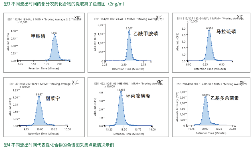 本方法采用一針進(jìn)樣,通過Time Managed MRM正負(fù)切換模式同時(shí)測定331種化合物及其45種代謝物,共375個(gè)化合物,其中365種化合物采用正離子模式采集,10種化合物采用負(fù)離子模式采集。圖1中展示了375種化合物的提取離子疊加譜圖,圖2中是單獨(dú)10個(gè)負(fù)離子化合物的提取離子色譜圖。經(jīng)過優(yōu)化色譜洗脫條件,圖3展示了不同保留時(shí)間的部分農(nóng)藥化合物的提取離子色譜圖。各個(gè)化合物峰型對稱,軟件中TimedMRM功能目動完成375個(gè)化合物的軒留時(shí)間分配,保讓每個(gè)色語峰上有足夠的來集點(diǎn)教,以使獲得準(zhǔn)確的結(jié)果為優(yōu)異的重復(fù)性,不同流出時(shí)間的代表性化合物的色譜圖采集點(diǎn)數(shù)情況示例詳見圖4。