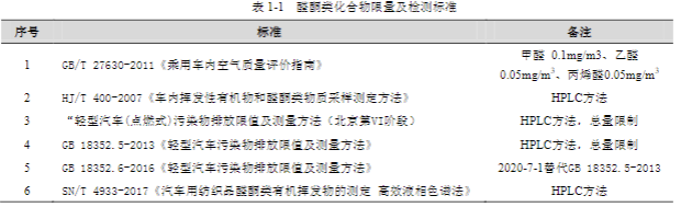 以下標(biāo)準(zhǔn)分別對汽車尾氣、內(nèi)飾、車內(nèi)空氣限量標(biāo)準(zhǔn) / 檢測方法進(jìn)行了規(guī)范,以盡量減少醛酮化合物的污染: