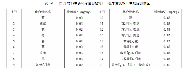 汽車內(nèi)有多種物質(zhì)可能向車內(nèi)釋放多環(huán)芳烴,如汽車的配件 (坐墊、座椅套)、車內(nèi)飾 (門內(nèi)護(hù)板) 以及生產(chǎn)車時(shí)使用的油漆、稀釋劑、粘合用的膠水,甚至一些劣質(zhì)的香水、空氣凈化劑等,都可能含有多環(huán)芳烴。全國汽車標(biāo)準(zhǔn)委員會(huì) 2019 年 5 月 13 日公布了《汽車材料中多環(huán)芳烴的檢測》(征求意見稿),該標(biāo)準(zhǔn)是新制定的行業(yè)標(biāo)準(zhǔn),將作為 GB30512《汽車禁用物質(zhì)要求》的修訂版配合標(biāo)準(zhǔn)實(shí)施,預(yù)計(jì) 2020 年開始執(zhí)行。