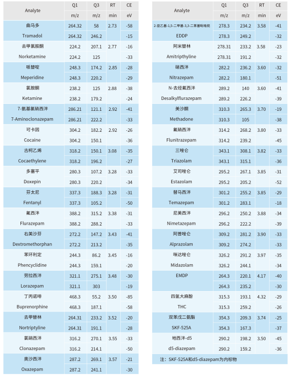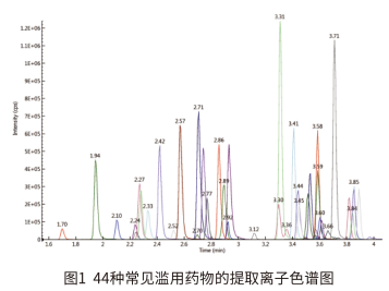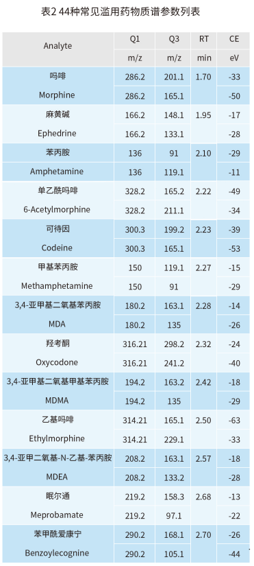 MS2 Vertical 9100 建立了快速、高靈敏度和可靠的 LC-MS/MS 實驗方法測定常見 44 種濫用藥物的含量。實驗結果表明,本方法具有分析速度快、線性范圍寬和靈敏度高等特點,適用于司法刑偵領域中常見濫用藥物的定性定量分析。