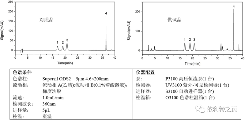 2. 供試品溶液的制備:取裝量差異項下的本品內(nèi)容物,研細(xì),取約0.2g,精密稱定,置具塞錐形瓶中,精密加入60%乙醇25mL,密塞,稱定重量,超聲處理(功率250W,頻率40kHz)20分鐘,放冷,再稱定重量,用60%乙醇補足減失的重量,搖勻,濾過,取續(xù)濾液,即得。