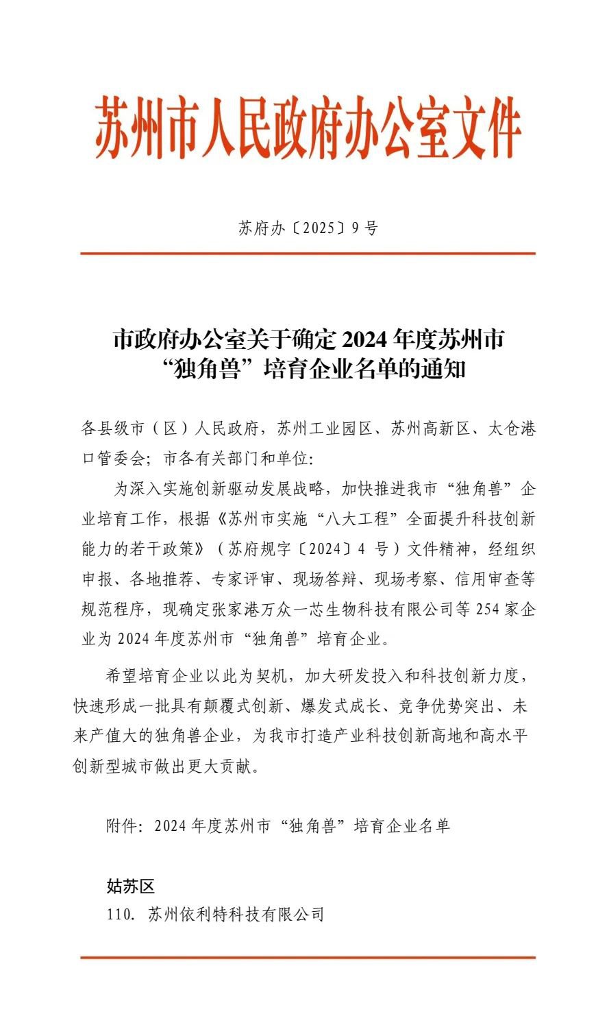 2025年2月11日,蘇州——近日,蘇州市政府正式發(fā)布《2024年度蘇州市“獨角獸”培育企業(yè)名單》,蘇州依利特科技有限公司作為姑蘇區(qū)首家且唯一入選企業(yè),成功躋身這一具有戰(zhàn)略意義的創(chuàng)新梯隊。這一里程碑式突破,標志著姑蘇區(qū)在培育高成長性科技企業(yè)、構(gòu)建現(xiàn)代化產(chǎn)業(yè)體系方面取得重要進展。