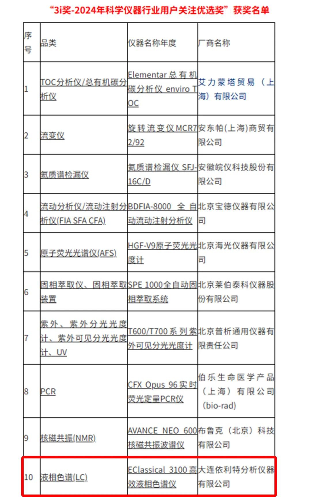 2025年5月12日,第十八屆中國科學(xué)儀器發(fā)展年會(huì)(ACCSI2025)在上海盛大開幕。大會(huì)吸引超1700位科學(xué)儀器行業(yè)相關(guān)政府領(lǐng)導(dǎo)、院士專家、儀器企業(yè)CEO、檢測機(jī)構(gòu)負(fù)責(zé)人、投資人、媒體記者等參會(huì),會(huì)議規(guī)模再創(chuàng)新高。備受矚目的“儀器及檢測3i獎(jiǎng)?lì)C獎(jiǎng)典禮”于當(dāng)晚隆重舉行,在行業(yè)內(nèi)人士的見證下,“3i獎(jiǎng)-2024年度科學(xué)儀器行業(yè)用戶關(guān)注優(yōu)選獎(jiǎng)”獲獎(jiǎng)名單揭曉,其中依利特科技EClassical 3100 高效液相色譜儀獲此殊榮。