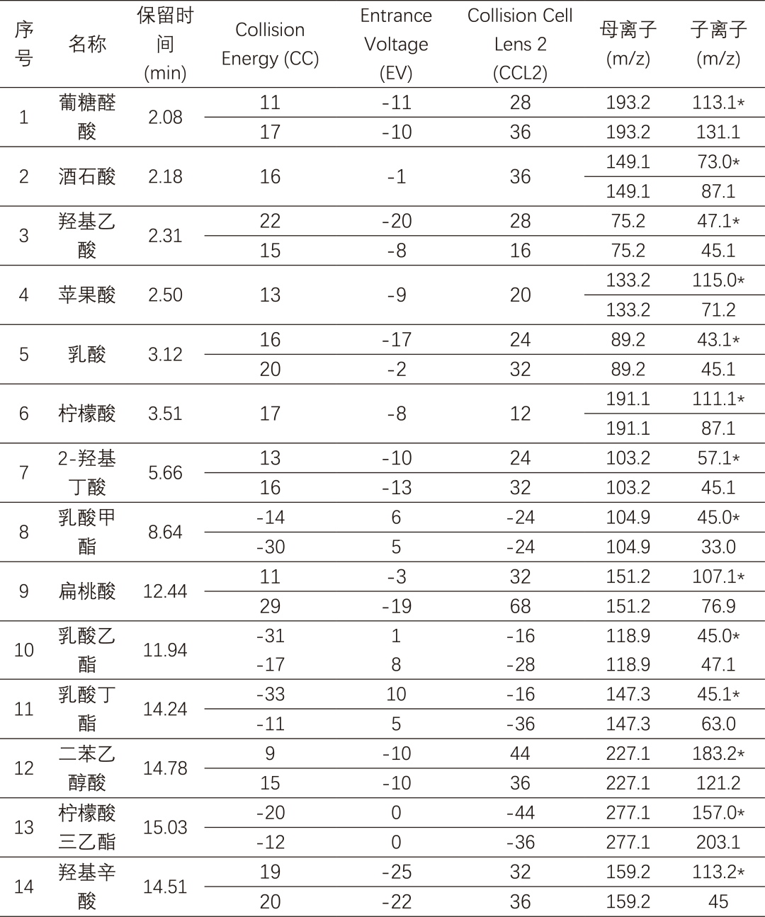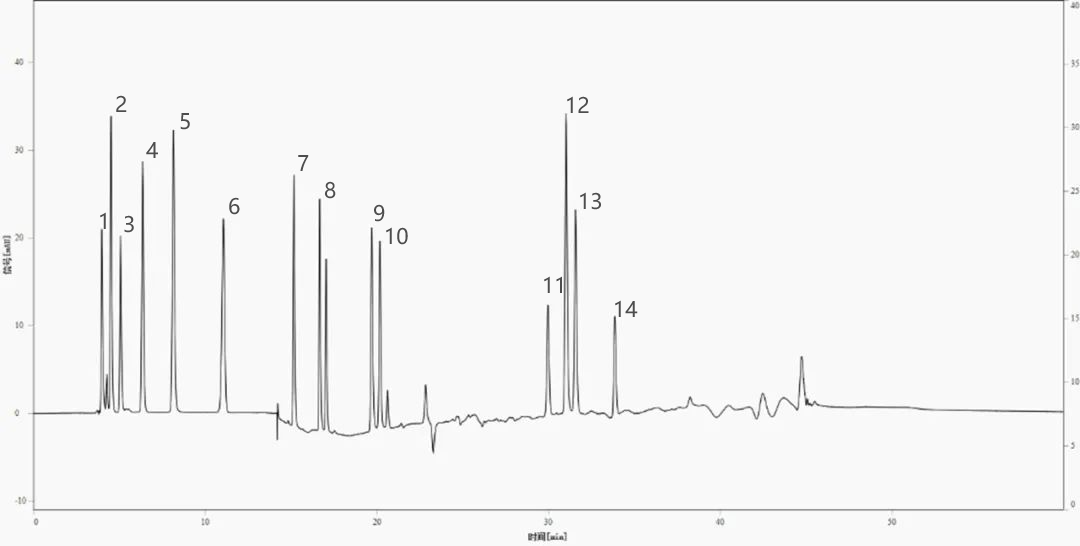 14種混標(biāo)色譜圖1.葡糖醛酸 2.酒石酸 3.羥基乙酸 4.蘋果酸 5.乳酸 6.檸檬酸 7.2-羥基丁酸 8.乳酸甲酯 9.扁桃酸10.乳酸乙酯 11.乳酸丁酯 12.二苯乙醇酸 13.檸檬酸三乙酯 14.羥基辛酸