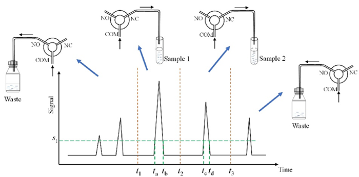 時間+閾值組合(更精準): 例如,設定在t1-t2時間段內收集“樣品1”,但只有當此時間段內信號強度也同時達到閾值s時,才真正啟動收集閥切換到收集狀態(tài)(NC口連通),否則視為無效或廢液(NO口連通)。這有效避免了收集到非目標或低濃度餾分,提高了目標物的純度和回收率。