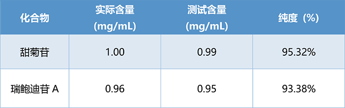 2、分離純化效能: 選擇甜菊糖苷中高價值組分——甜菊苷和瑞鮑迪苷A作為測試樣品,設備自動進樣10mL樣品,利用其時間+閾值方法精準收集目標餾分。如下表所示,純度均高于93%,相比文獻報道的傳統(tǒng)三步樹脂法(~92.9%)更具優(yōu)勢。證明了設備在快速分離、穩(wěn)定輸出、精準收集上的性能,顯著提升產品純度和效率。