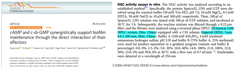 英國大綜合類期刊Nature Communications,創(chuàng)刊于2010年,是首個冠名“Nature”品牌的純開放獲取刊物,由英國Nature Publishing Group出版社出版發(fā)行。Nature Communications致力于發(fā)表生物、醫(yī)學、健康、物理、化學和地球科學等各領(lǐng)域的高質(zhì)量研究。據(jù)統(tǒng)計2022年該雜志的影響因子為14.91。該期刊在13期1493(2022)發(fā)表一篇《cAMP and c-di-GMP synergistically support biofilm maintenance through the direct interaction of their effectors》文章。該文章提供了在細菌中cAMP和c-di-GMP通路之間通過效應物直接相互作用的證據(jù),并表明cAMP-CRP可以在翻譯后發(fā)揮調(diào)節(jié)作用。其中DGC體外活性測定中核苷酸檢測分析使用的就是依利特的EClassical系列液相色譜儀以及依利特Supersil系列色譜柱。