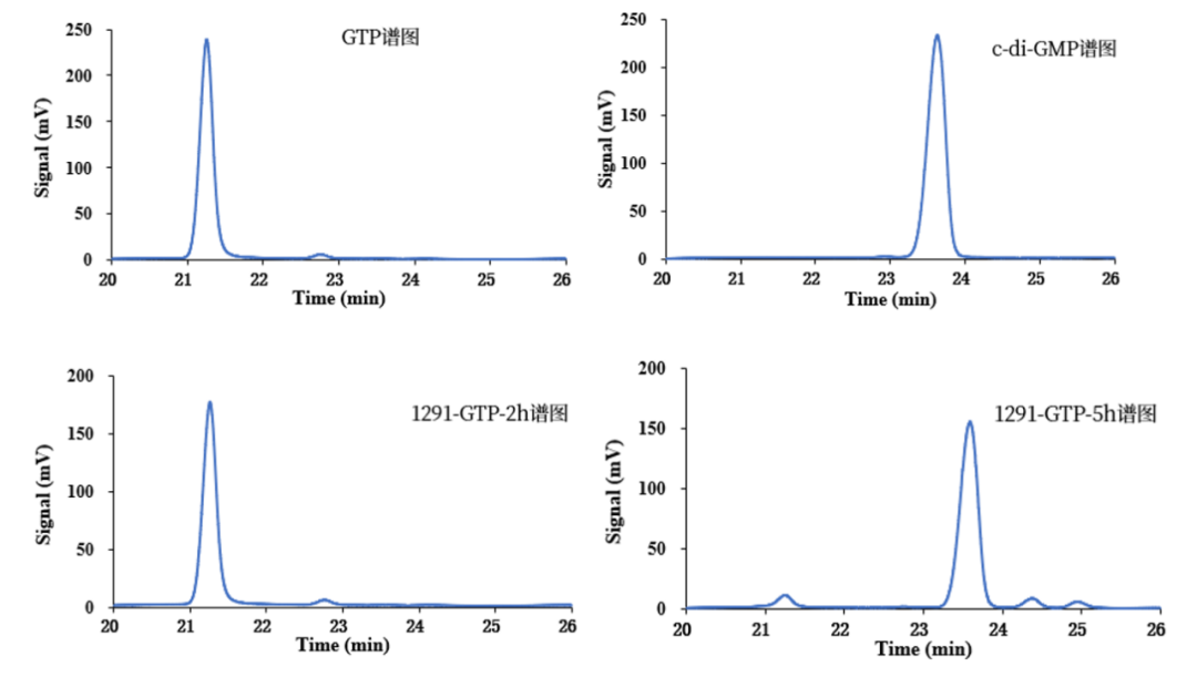 通過依利特EClassical 3100液相色譜儀搭配經(jīng)典Superisil ODS2色譜柱,對樣品中核苷酸進行實時檢測。結(jié)果顯示,隨著時間的推移,樣品中的GTP逐漸轉(zhuǎn)化成了c-di-GMP,而GTP轉(zhuǎn)化成c-di-GMP的體外催化過程需要活性DGC的參與。因此,該實驗表明:該樣品中含有活性DGC。