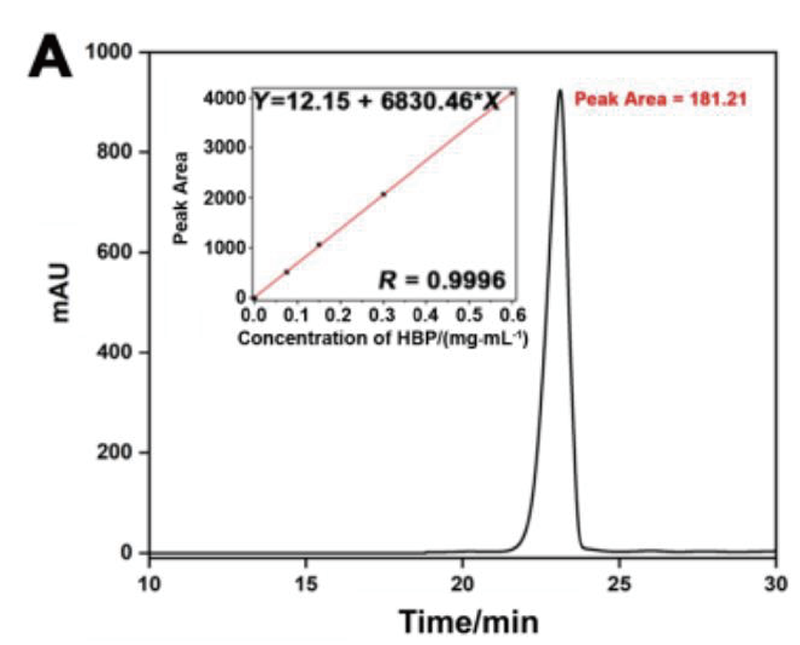 通過(guò)依利特EClassical 3100液相色譜儀搭配經(jīng)典Superisil ODS2色譜柱,對(duì)檢測(cè)介質(zhì)中的HBP NPs含量進(jìn)行測(cè)試。檢測(cè)HBP NPs的累積釋放量表明,在模擬的生理環(huán)境和腫瘤的微酸性條件下,HBP從HBP NPs中緩慢釋放,這將有助于延長(zhǎng)藥物作用時(shí)間,保持對(duì)腫瘤血管的持續(xù)破壞,從而達(dá)到持續(xù)抑制腫瘤的效果。