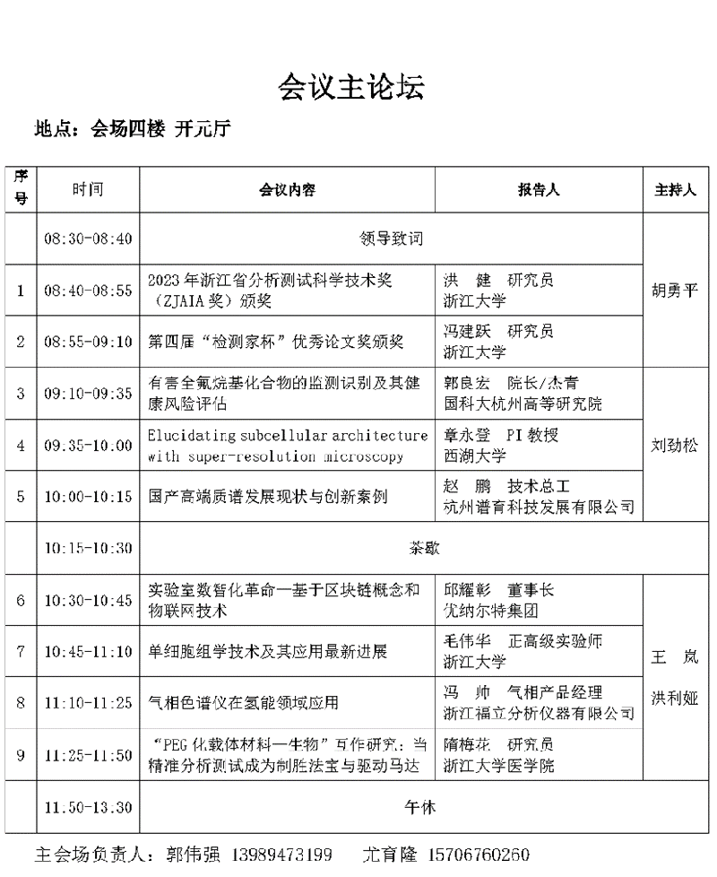本次會議為期一天,上午設主會場,邀請了省內外知名專家學者作大會報告;下午設7個分會場:色譜與質譜分析、光譜與電化學分析、電鏡與微結構分析、細胞生物與生化分析、生物大分子分析、核磁共振波譜分析以及檢驗檢測機構等專業(yè)領域的專家學者及青年學者作分會場專題報告。會議還設有國內外廠商分析測試儀器及相關設備展區(qū)。