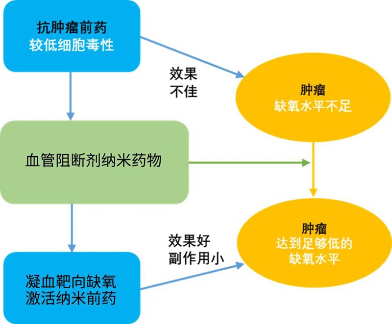 缺氧是實體腫瘤的共同特征,被認為是腫瘤治療的佳靶點之一。但是實體腫瘤細胞中的缺氧水平往往達不到選擇性激活腫瘤治療藥物的需求。如果在遞送腫瘤治療藥物的同時,能夠遞送加劇腫瘤區(qū)域缺氧的藥物,就能更有效地靶向治療,精準地在目標腫瘤區(qū)域差異化地激活治療藥物,讓腫瘤藥物療效顯著增長,同時還能有效降低藥物在體內代謝循環(huán)過程中的毒副作用和風險。