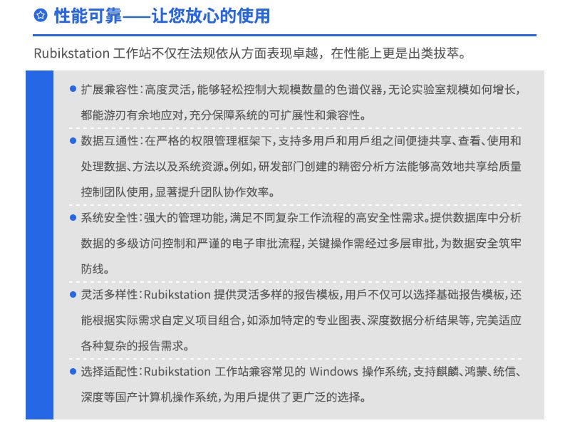 Rubikstation 網(wǎng)絡(luò)版液相色譜數(shù)據(jù)工作站所有功能設(shè)置均基于“簡明易用、法規(guī)依從”的原則,確保您的色譜儀器分析工作流程能減少不必要的操作環(huán)節(jié),使用者能更快適應(yīng)軟件邏輯和界面,提高工作效率。在靈活的模塊功能及報告設(shè)計支持前提下,同時滿足嚴(yán)格的合規(guī)性要求,提供強(qiáng)大的數(shù)據(jù)安全保障、完善的審計追蹤功能。