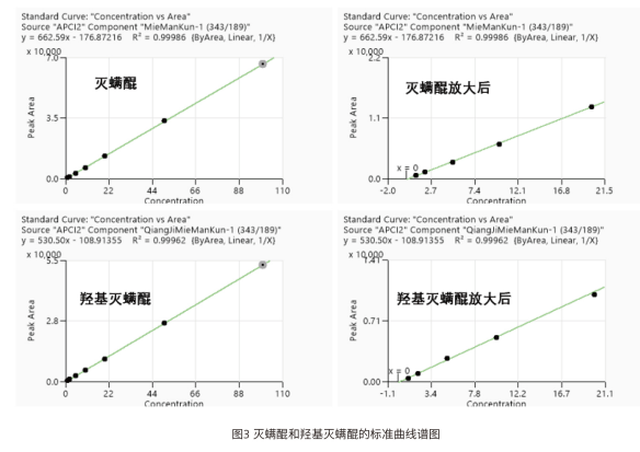 本文采用 EClassical 3200L-MS2 Vertical 9100 三重四極桿液質(zhì)聯(lián)用系統(tǒng),建立了快速、高靈敏度且可靠的 LC-MS/MS 方法,用于測(cè)定食品中滅螨醌和羥基滅螨醌,為該類化合物提供了高通量檢測(cè)手段,檢出限完全滿足相關(guān)標(biāo)準(zhǔn)要求。滅螨醌:y=530.50x-108.91355,R2=0.99962;羥基滅螨醌:線性方程及 R2 詳見(jiàn)完整譜圖,R2≥0.999)