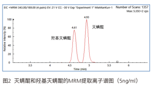 同時(shí)考察了該方法的儀器檢出限情況,在0.5ng/ml的濃度下,羥基滅螨醒和滅螨醒的的信噪比分別為11和12,如下圖所示,可見(jiàn)該方法靈敏度較高,完全滿足該標(biāo)準(zhǔn)的檢出要求。