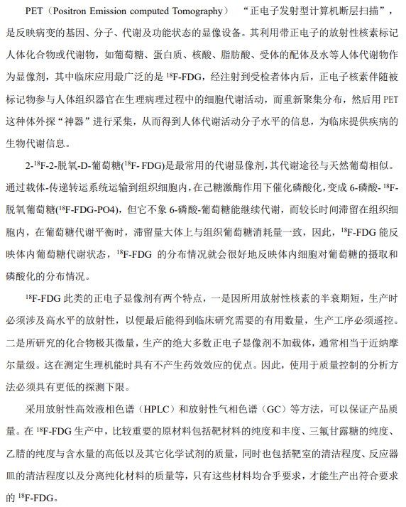 \(^{18}\text{F}\)是載于美國藥典的第一個 PET 放射性藥物,需要對放射性核純度、化學(xué)純度、放射化學(xué)純度、比活度等質(zhì)量指標(biāo)進(jìn)行控制,同時需要對合成反應(yīng)的副產(chǎn)物含量進(jìn)行控制,而液相色譜法是進(jìn)行\(zhòng)(^{18}\text{F}\)-FDG 化學(xué)純度分析的好方法。