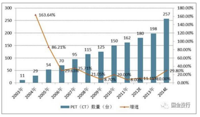 正是 PET-CT 在部分領(lǐng)域的獨特效用,國內(nèi)裝機(jī)數(shù)量不斷增長。根據(jù)相關(guān)普查情況,自本世紀(jì)初西安萬杰長信醫(yī)院(現(xiàn)已更名 “長安醫(yī)院”)購買了中國大陸第一臺 PET-CT 設(shè)備,中國 PET-CT 的數(shù)量已經(jīng)增長到 2014 年的 257 臺,年均復(fù)合增長率超過 30%。