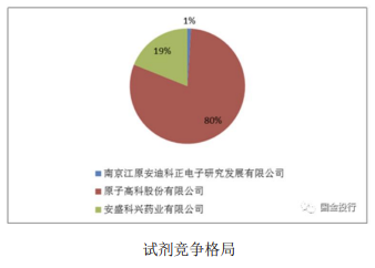 對我們來講,配套試劑 FDG 注射液的制備純化和純度分析需要用到液相色譜,而 FDG 注射液目前主要是國內(nèi)公司占據(jù)主要市場份額,PDB 數(shù)據(jù)庫顯示南京江原、原子高科、安盛科興基本占據(jù)全部市場。其中原子高科的市場占有率高,達(dá)到近 80%,主要歸功于其市場布局較為完善,價格低于安盛科興。