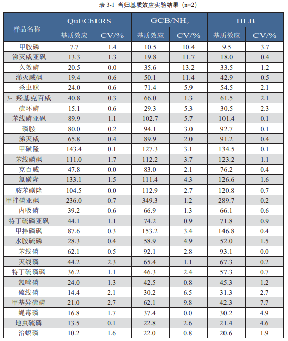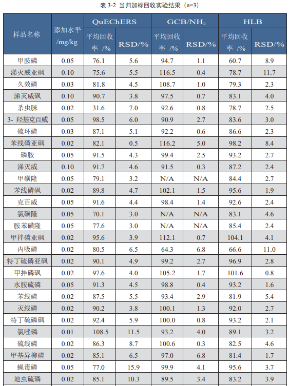 由表 3-2 可知,分別采用 QuEChERS 和固相萃取法處理當歸中的 30 種農(nóng)藥殘留,HLB 處理的樣品,所有目標物的加標回收率均在 60~120% 之間,RSD 小于 20%;其他方法均有數(shù)量不等的目標物回收率偏低的情況,不能滿足實驗要求;由圖 1~4 可知,凈化液濃縮后均會有少量的揮發(fā)油,帶有揮發(fā)油的基質(zhì)容易引起較大的基質(zhì)效應,對于此類化合物,從表 3-1 基質(zhì)效應及表 3-2 回收率綜合分析來看,HLB 凈化柱的效果佳。