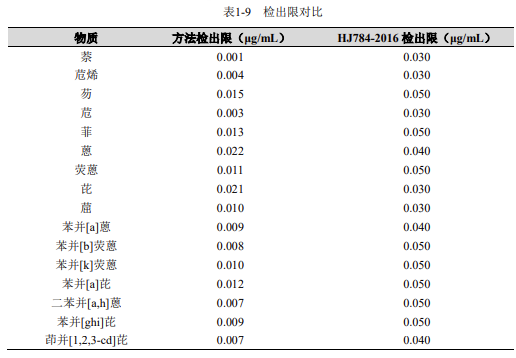 以 3 倍信噪比對(duì)應(yīng)的濃度換算為儀器的檢出限,以 10 倍信噪比對(duì)應(yīng)的濃度為儀器的定量限。計(jì)算 16 種多環(huán)芳烴的檢出限,并推出 16 種多環(huán)芳烴的方法檢出限結(jié)果如下表所示: