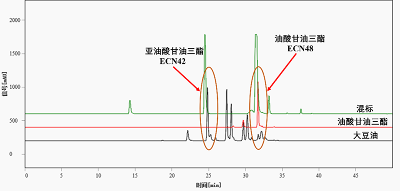 圖1. 大豆油樣品與油酸甘油三酯標液以及甘油三酯的混標溶液的疊加色譜圖