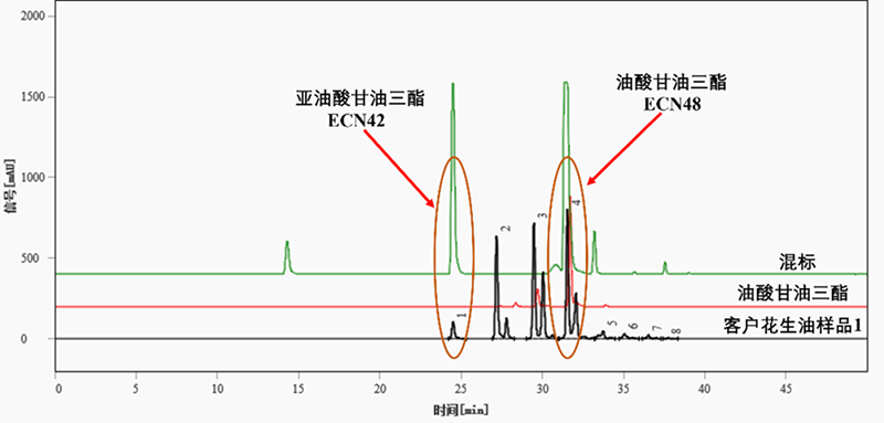 圖2. 花生油樣品與油酸甘油三酯標液以及甘油三酯混標溶液的疊加色譜圖