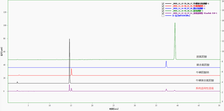 圖1顯示了人工牛黃膽酸類系統(tǒng)適用性溶液在SinoPak C18色譜柱上的分離色譜圖。圖中四個色譜峰(依次為牛磺豬去氧膽酸、牛磺膽酸鈉、鵝去氧膽酸、脫氧膽酸)基線分離良好,峰形尖銳對稱,直觀表明該色譜系統(tǒng)對這幾類結構相似的化合物具有優(yōu)異的分離能力。圖3為系統(tǒng)適用性溶液及對應單標在SinoPak C18色譜柱上分離的疊加色譜圖,進一步證實了系統(tǒng)適用性溶液與對照品溶液中對應峰的一致性。