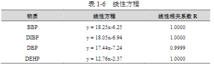 由表 1-6 可知,按照本解決方案提供的儀器及檢測方法進行分析,DEHP、DBP、BBP、DIBP 在濃度 1μg/mL~100μg/mL 濃度范圍內(nèi),線性相關(guān)性良好。