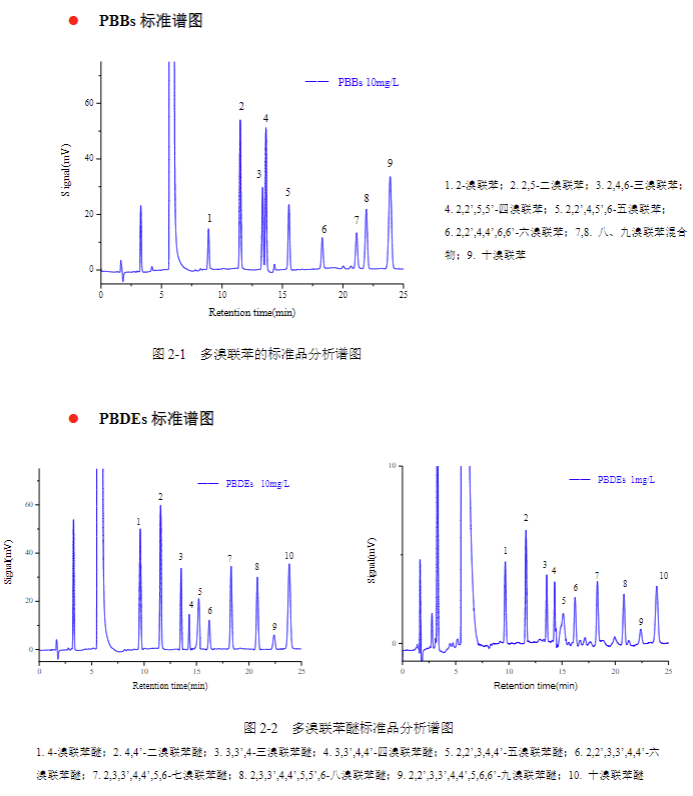 PBBs:移取 PBBs 標準溶液適量,用甲苯稀釋成 25mg/L,再用乙腈稀釋成 10mg/L 的標準溶液,備用。