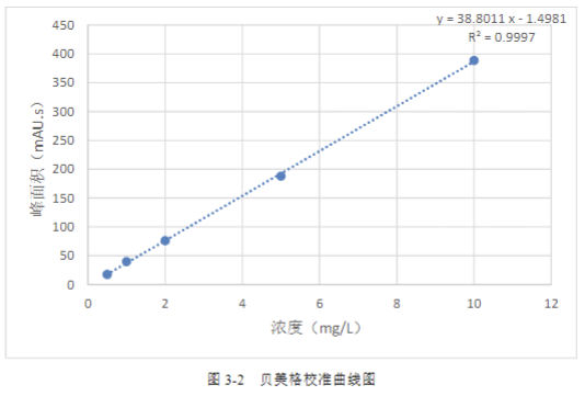 按 GB/T 40898-2021 標(biāo)準(zhǔn)中方法,配制貝美格的標(biāo)準(zhǔn)溶液,質(zhì)量濃度為 0.5 mg/L、1 mg/L、2 mg/L、5 mg/L 和 10 mg/L 的五個(gè)標(biāo)點(diǎn),計(jì)算相關(guān)線性系數(shù)。