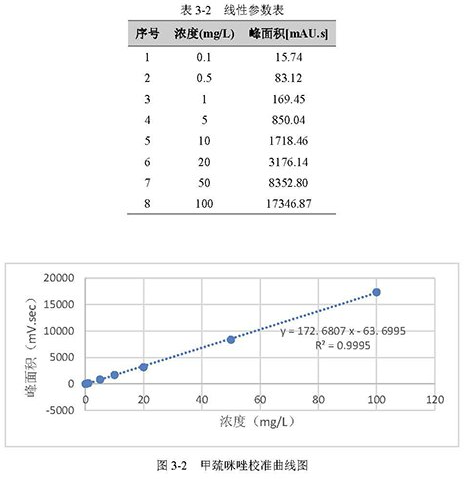 參照 GB/T 40894-2021 標(biāo)準(zhǔn)中方法,配制甲巰咪唑的標(biāo)準(zhǔn)溶液,質(zhì)量濃度為 0.1 mg/L、0.5 mg/L、1 mg/L、5 mg/L、10 mg/L、20 mg/L、50 mg/L 和 100 mg/L 的八個標(biāo)點(diǎn),計算相關(guān)線性系數(shù)。
