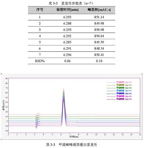 用濃度為 5 mg/L 甲巰咪唑標(biāo)準(zhǔn)溶液,連續(xù)進(jìn)樣 7 針,峰面積和保留時間 RSD 結(jié)果如下: