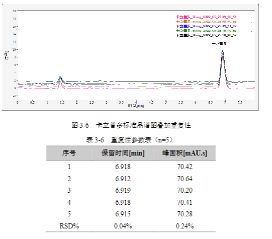 濃度為50 mg/L卡立普多 標(biāo)準(zhǔn)溶液,連續(xù)進(jìn)樣 5針,峰面積和保留時(shí)間 RSD結(jié)果如下: