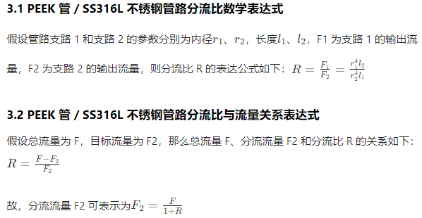 通過 PEEK 管 / SS316L 不銹鋼管路分流比數(shù)學(xué)表達(dá)式計(jì)算,可選取內(nèi)徑為 0.04”I.D.、長為 256mm 的 PEEK 管作為支路 1;內(nèi)徑為 0.01”I.D.、長為 999mm 的 PEEK 管作為支路 2,則支路 2 的流量即為 1μL/min。