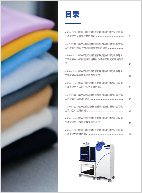 文集覆蓋紡織品等化工消費(fèi)品中 9 大類高關(guān)注度物質(zhì)的檢測,適配不同基質(zhì)與法規(guī)要求,具體包括: