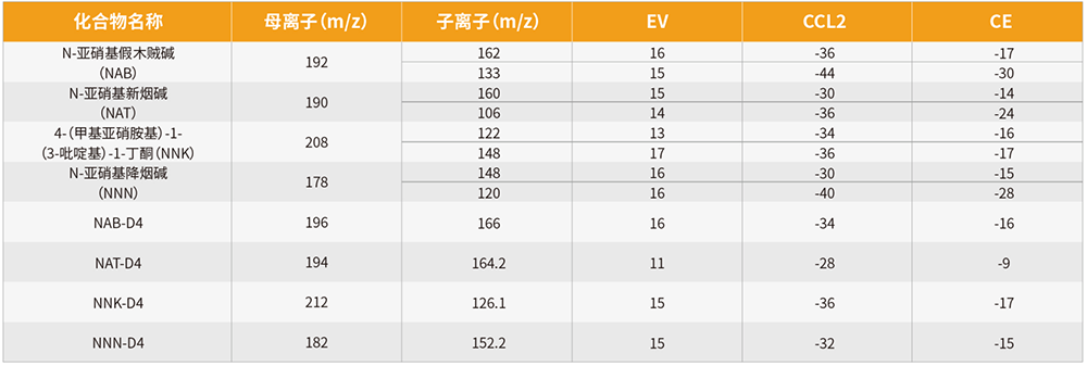 液質(zhì)聯(lián)用技術(shù)結(jié)合了色譜強大的分離功能和質(zhì)譜準(zhǔn)確的定性功能,能很好的分析痕量水平的 TSNAS,并且前處理方法簡單快速,與傳統(tǒng)的 GC-TEA 方法相比,靈敏度更高、選擇性更強。故本文參考中國煙草總公司企業(yè)標(biāo)準(zhǔn) YO/T 17-2012《卷煙主流煙氣總粒相物中煙草特有 N - 亞硝胺的測定 高效液相色譜 - 串聯(lián)質(zhì)譜聯(lián)用法》,采用 EClassical 3200L-MS2 Vertical 9100 液相質(zhì)譜聯(lián)用系統(tǒng)對卷煙主流煙氣中的特有 N - 亞硝胺進(jìn)行測定,其四種物質(zhì)的定量限完全滿足并在靈敏度和檢測速度優(yōu)于標(biāo)準(zhǔn)的檢測需求。