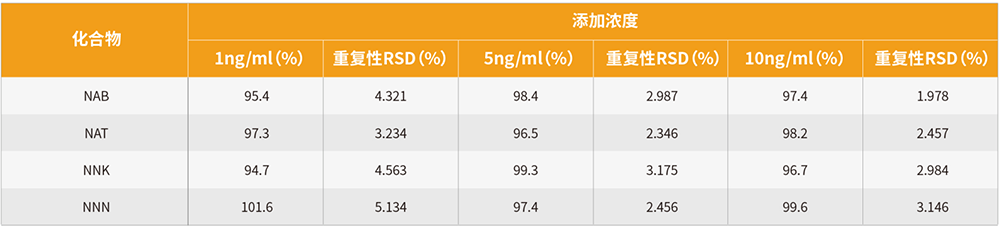同時考察了 1ng/ml、5ng/ml、10ng/ml 添加濃度下的加標(biāo)回收率和每個加標(biāo)濃度下 6 針的重現(xiàn)性測試 (見表 4),實驗結(jié)果表明,該方法具有良好的回收率和重現(xiàn)性,完全滿足卷煙主流煙氣中特定 N - 亞硝胺含量的測定。